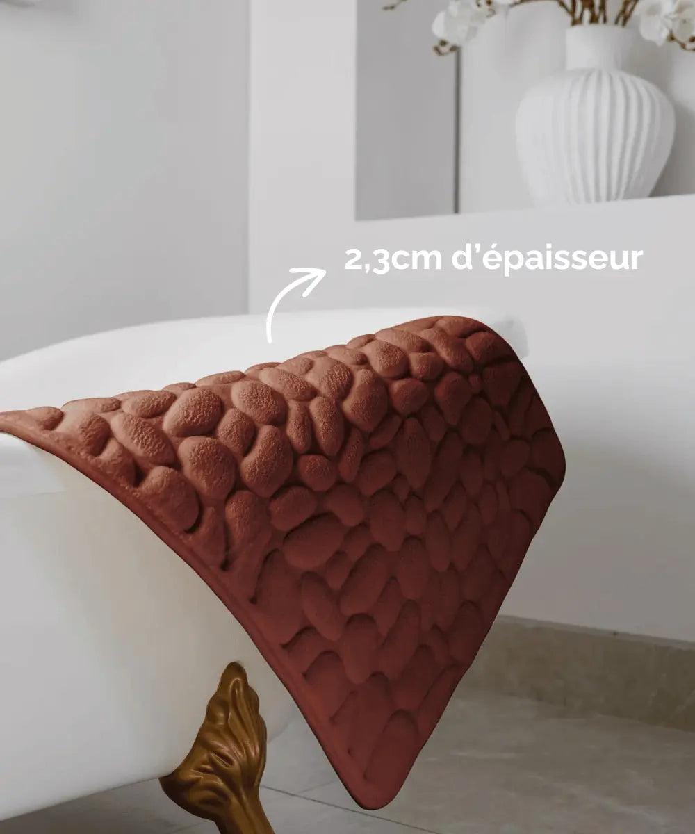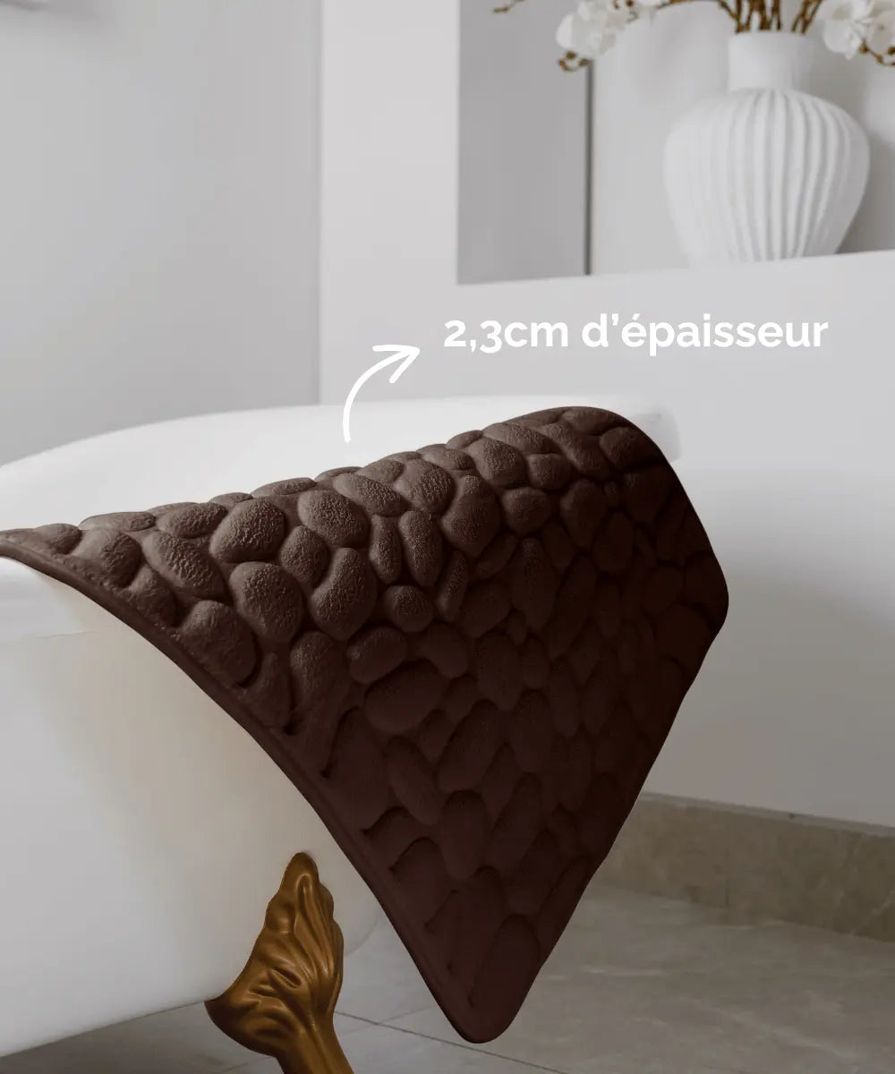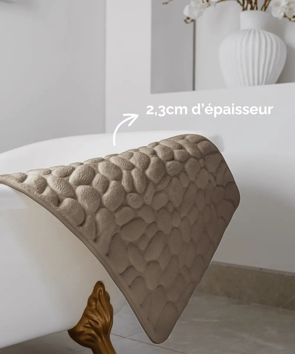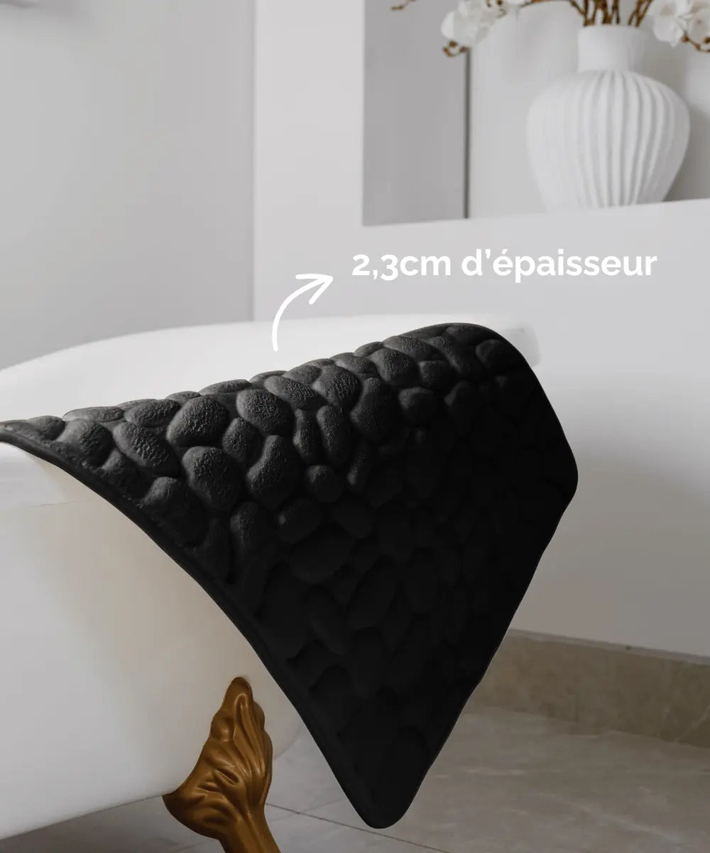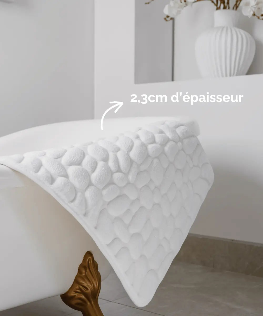 Oui, notre tapis de bain en galets a une épaisseur exceptionnelle de plus de 18 mm, un record imbattable dans le monde du tapis de bain haut de gamme. Ce qui le rend incroyablement moelleux et confortable pour vos pieds à la sortie de la douche ou du bain.